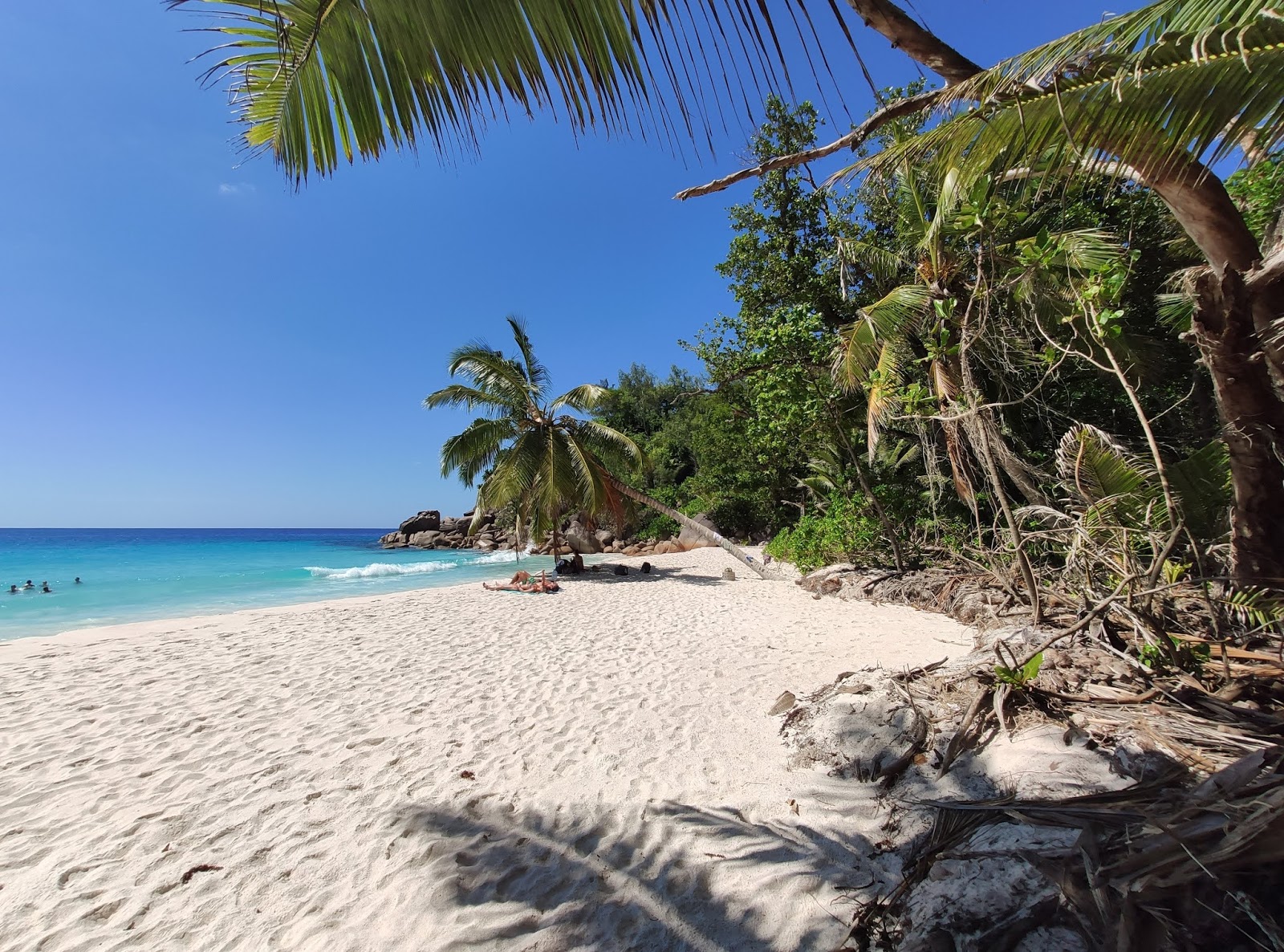Then, as the trees open, you see it, a flash of impossible turquoise through the branches. Anse Georgette. Below, the beach unfurls in a perfect crescent of white sand framed by granite boulders that have stood for centuries. From up here, the world feels paused, waves folding in slow motion, light dancing over the water like liquid glass.